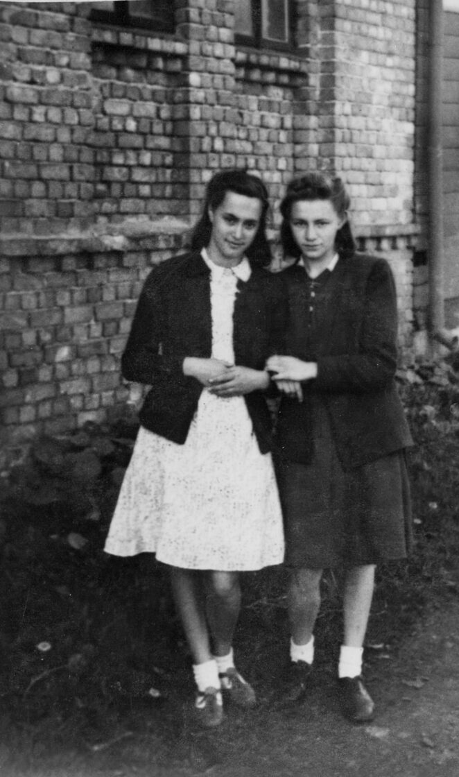 Kādā Sarkandaugavas pagalmā | No labās: Lūcija Klauģe un Dzidra Priedniece | Ap 1948. -