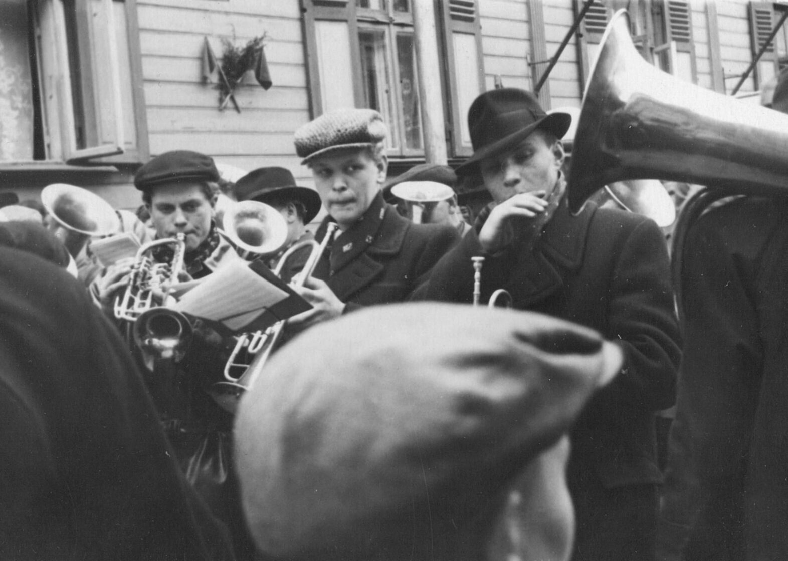 Pēteris Klauģis muzicē ar pūtēju orķestri (pirmais no labās)